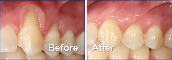Connective Tissue Grafts: In some cases a piece of tissue is harvested from the roof of your mouth and transferred below the gumline of the area of recession. The gums are then pulled up and over the top of the grafted tissue. This technique is very predictable and looks very natural because it is your own tissue. Connective tissue grafting has remained the gold standard for treating gum recession. For further explanation schedule an appointment so we can determine if connective tissue grafting is right for you.